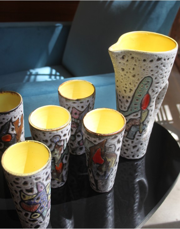 Service Accolay, une caraffe et 8 verres en céramique. Prix livraison sur demande