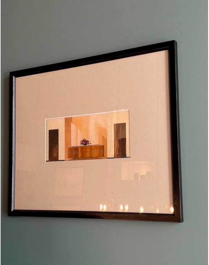 Gouache d'agence d’architecture des années 40, encadrement en bois noir avec léger liseré doré.